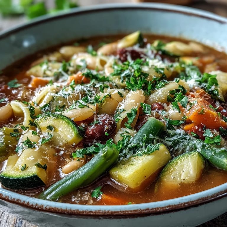 Pin it There's something about the smell of sautéed onions and garlic that stops me mid-afternoon, pulling me into the kitchen whether I planned to cook or not. My neighbor Maria taught me her version of minestrone one cold November, and what struck me wasn't just how simple it was, but how it tasted like every season at once—fresh beans, tender pasta, vegetables at their peak. She stirred the pot with one hand while gesturing dramatically with the other, explaining that good minestrone isn't about perfection; it's about what you have and what feels right that day.
